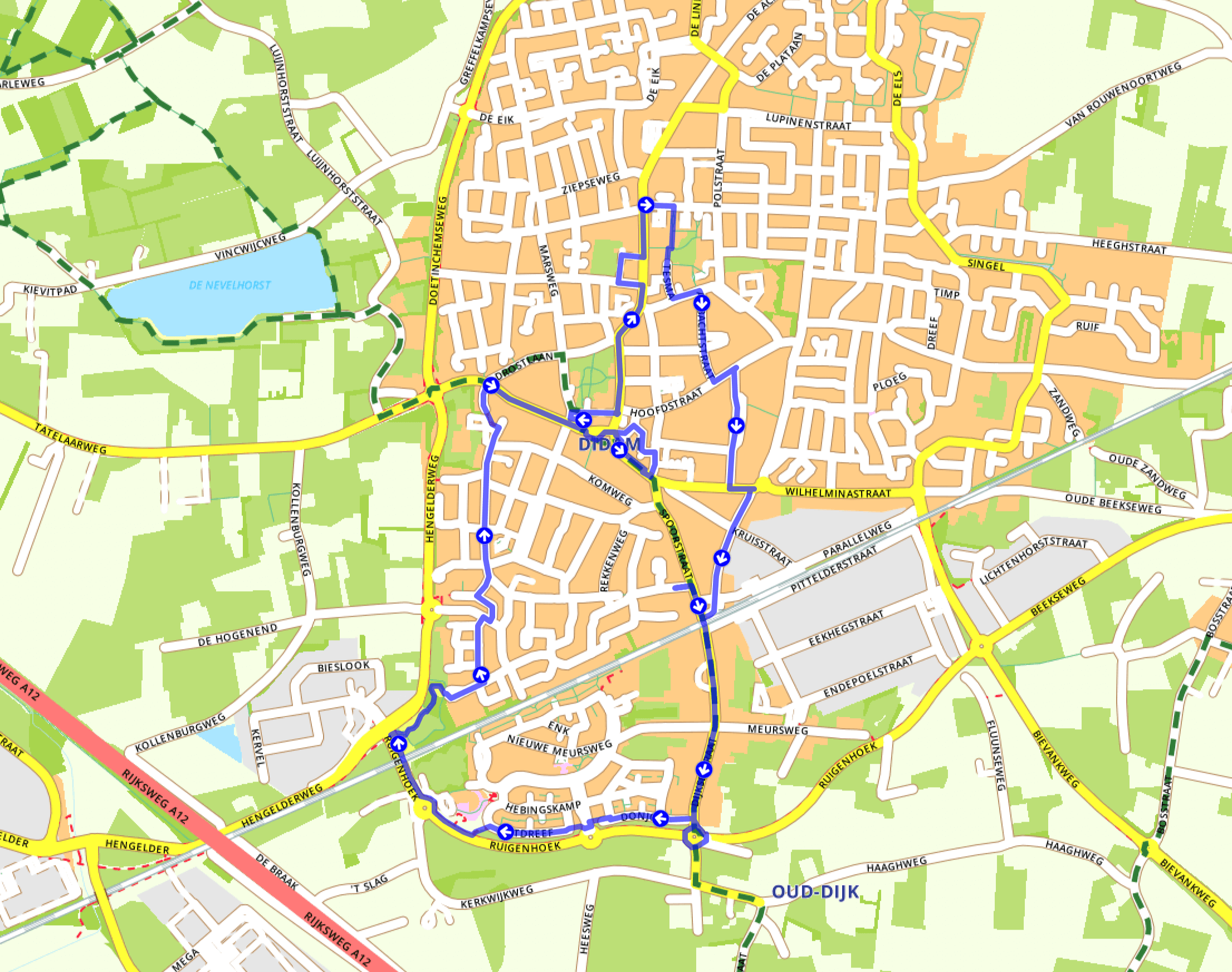 - Bij het einde van de Rietdreef volg je opnieuw het fietspad Ruigenhoek tot de Hengelderweg.